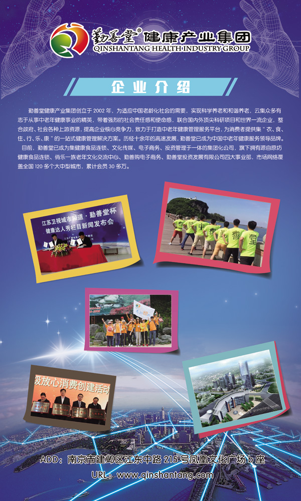 勤善堂健康产业集团创立于2002年,为适应中国老龄化社会的需要,实现科学养老和和谐养老,云集众多有志于从事中老年健康事业的精英,带着强烈的社会责任感和使命感,联合国内外科研项目和大型企业,整合政府、社会各种资源,提高企业核心竞争力,致力于打造健康产业著名品牌。历经十余年的高速发展,已成为中国中老年健康服务领导品牌。