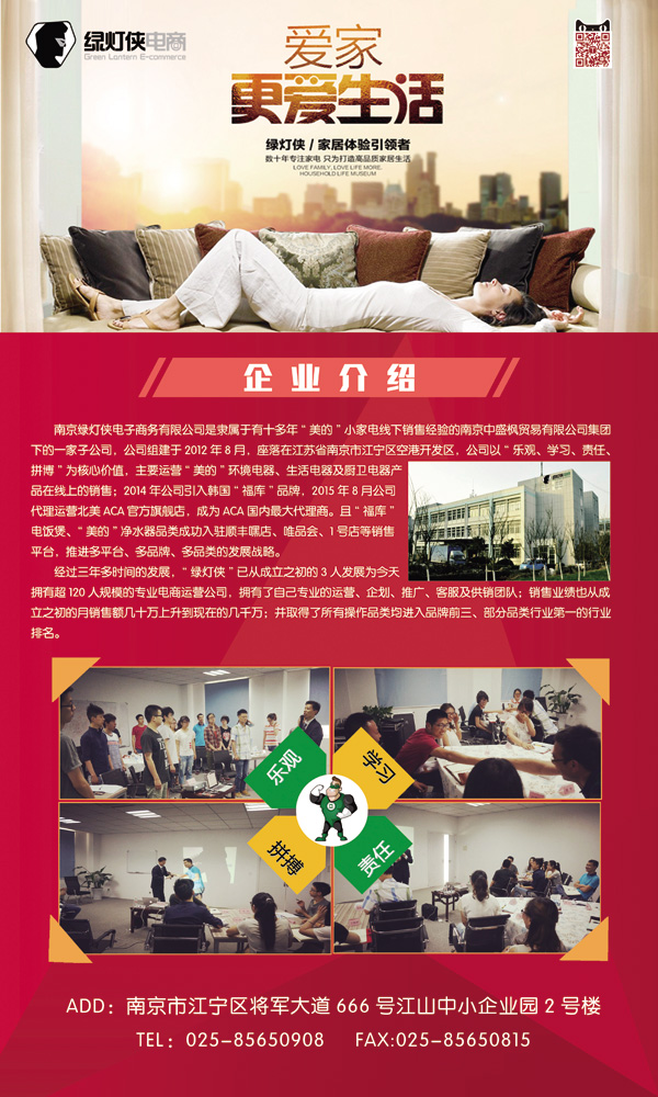 南京绿灯侠电子商务有限公司是隶属于有十多年“美的”小家电线下销售经验的南京中盛枫贸易有限公司集团下的一家子公司。公司组建于2012年9月,座落在江苏省南京市江宁区空港开发区,公司以“乐观、学习、责任、拼博”为核心价值,主要运营“美的”环境电器、生活电器及厨卫电器产品在线上的销售。于2014年公司引入韩国“福库”品牌,推进多品牌、多品类发展战略,且“福库”、“美的”品类成功入驻顺丰嘿客店、唯品会、1号店等销售平台。