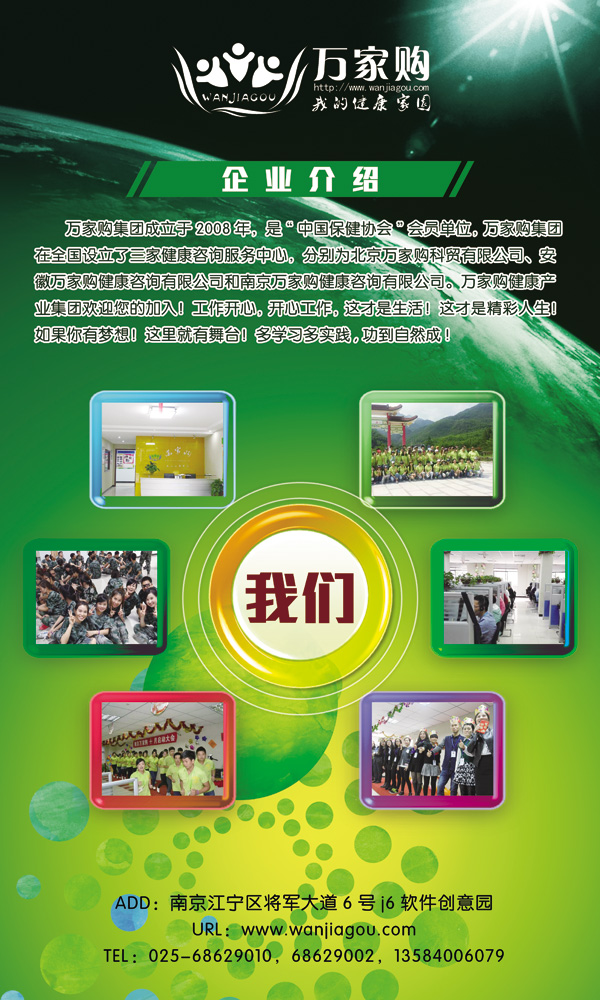 南京万家购健康咨询有限公司主要经营:健康信息咨询服务,网络技术服务。等产品。公司尊崇“踏实、拼搏、责任”的企业精神,并以诚信、共赢、开创经营理念,创造良好的企业环境,以全新的管理模式,完善的技术,周到的服务,卓越的品质为生存根本,我们始终坚持用户至上 用心服务于客户,坚持用自己的服务去打动客户。