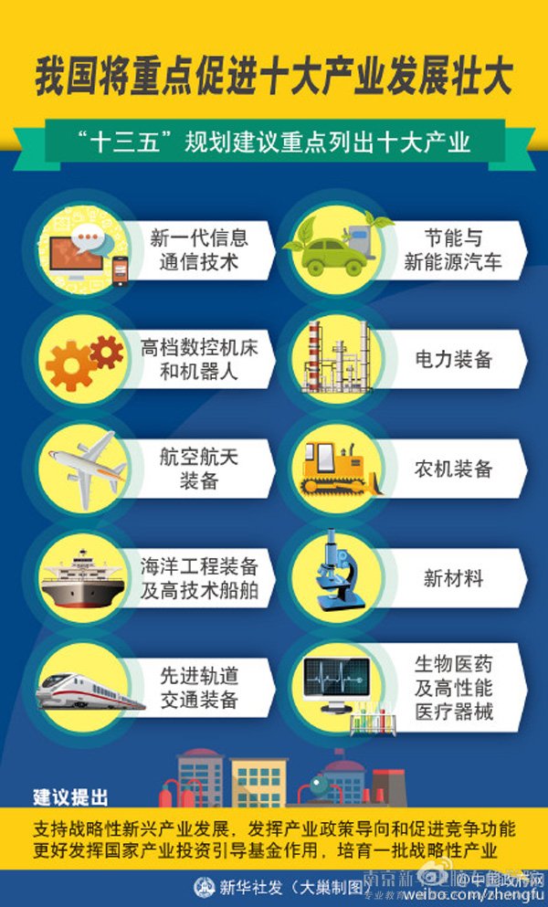 11月3日发布的“十三五”规划建议提出,加快建设制造强国,实施《中国制造2025》。实施智能制造工程,构建新型制造体系,促进新一代信息通信技术、高档数控机床和机器人、航空航天装备、海洋工程装备及高技术船舶、先进轨道交通装备、节能与新能源汽车、电力装备、农机装备、新材料、生物医药及高性能医疗器械等产业发展壮大。