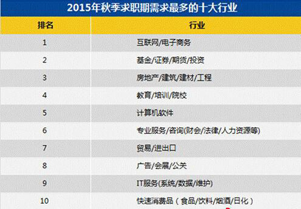 2015年秋季全国需求最旺盛的十个行业