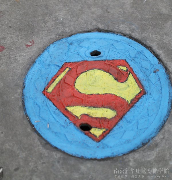 这不是超人胸前的“S”标志吗,那里还有外星宠物史迪奇,还有笑必露齿的海贼王……这些“萌萌哒”的图画都竟然出现在了井盖上。