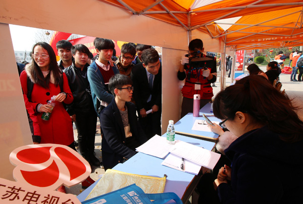 招聘会现场人头攒动,优越的招聘条件和优厚的待遇吸引了众多的学生前来应聘,各个招聘台前来咨询的求职者络绎不绝。据悉,现场设点的企业共百余家,汇集了长三角范围内众多优秀企业,招聘对象覆盖面广,主要包括企业经营管理人才和专业技术人才,涉及电子商务、软件开发、平面设计、影视动漫等各类岗位共计千余个。