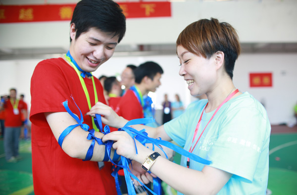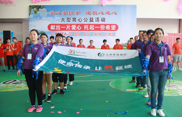 爱在身边,携手同行。“一对一沟通”这个环节,让参加者学会了相互倾听,打开心结;“全场人员大拼图”环节,让大家明白合作才能成功的道理;“风吹草动”环节,告诉人们人与人之间要相互信任和勇于担当……尤其是“感恩环节”和“系蓝丝带环节”把活动推向了高潮。