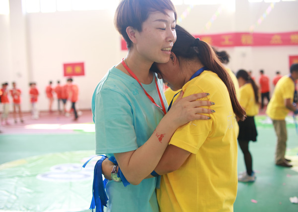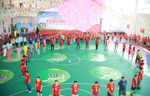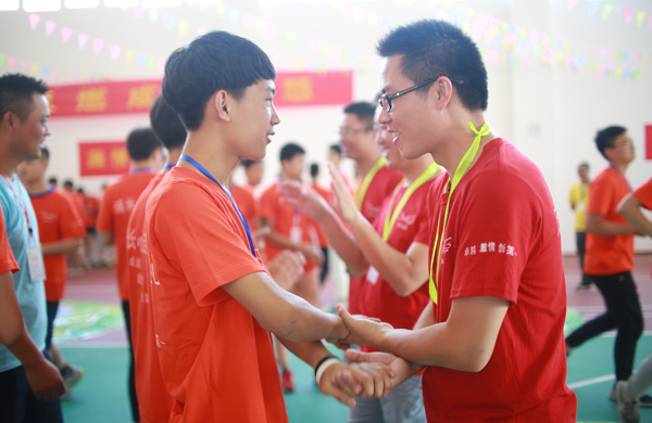 活动中,学生、家长、老师、义工分别换上绿色、灰色、蓝色、橙色的上衣,并随机分成20个小组,开展着一系列紧张而有趣的团队游戏活动。在各种互动环节中,参与者逐渐卸下陌生感,投入活动,体验各自角色在团队中的重要性,学习如何去接纳、关心和信任别人,领悟有效的沟通方法,凝聚爱的力量,激发内在潜能。