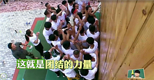拓展运动场上,“毕业墙”的翻阅,作为“风雪组合”的力量担当,张丹峰第一个攀爬毕业墙。在同学们的鼓励和协助下,呆呆峰顺利的爬上了巅峰,成为了同学们仰慕的对象,甚至有同学大喊:“同桌你最棒!”,在呆呆峰的引导下,大家都顺利的完成了任务,体现了团结就是力量的真谛。