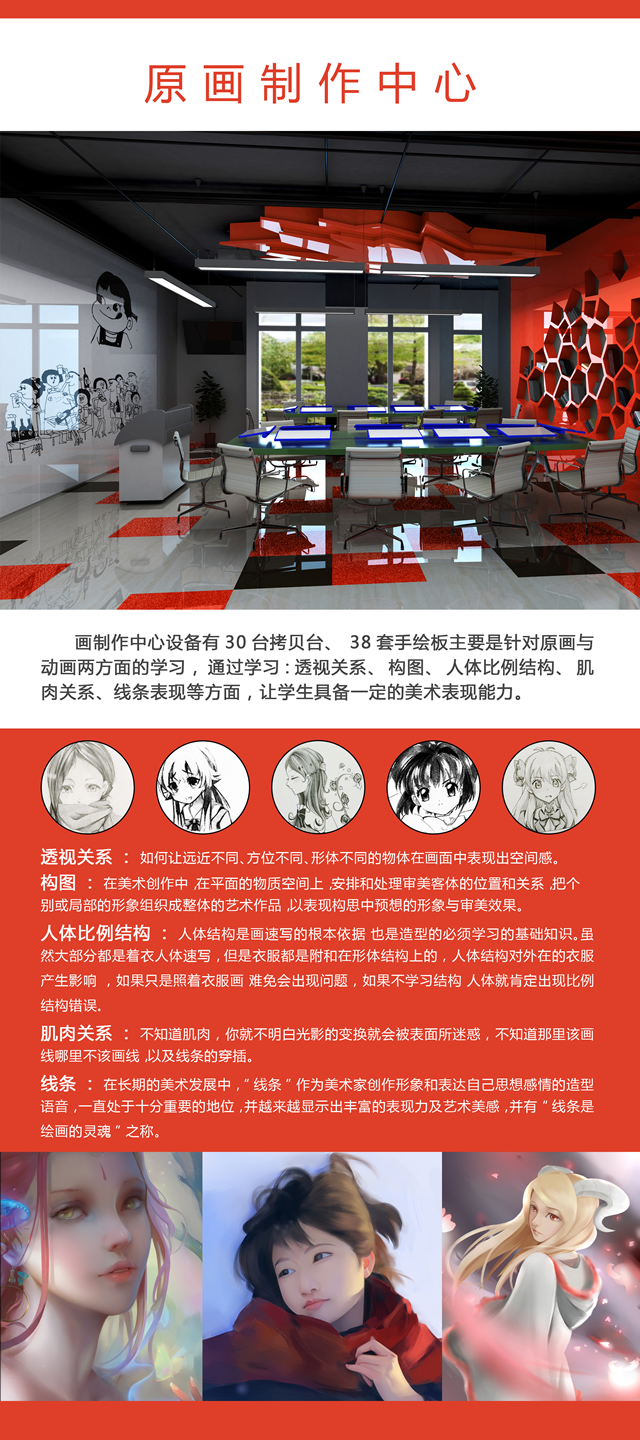 原画制作中心设备有30台拷贝台、38套手绘板主要是针对原画与动画两方面的学习,通过学习:透视关系、构图、人体比例结构、肌肉关系、线条表现等方面,让学生具备一定的美术表现能力。