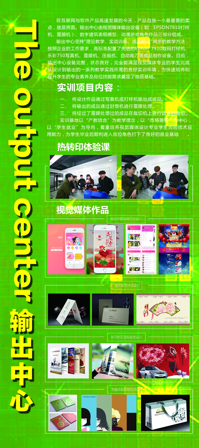 在互联网与软件产品高速发展的今天,产品自身一个最重要的卖点,就是界面。我院的视觉媒体输出中心,是在传统广告传媒实训基地的基础上,对设计的产品的改造升级。视觉媒体输出中心由热转印体验中心和视觉媒体输出中心两部分组成。拥有高质量的平面输出设备,如:EPSON7910打样机、覆膜机。