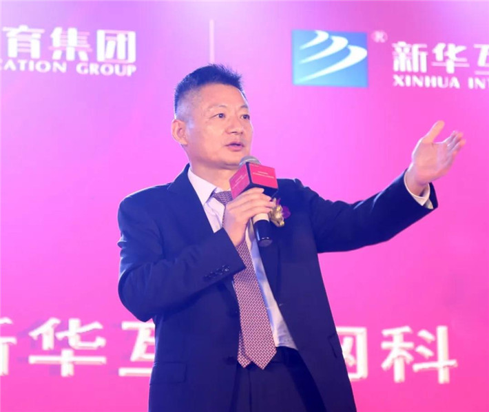 新华教育集团董事长吴伟为庆典致辞,强调不忘初心,砥砺前行。
